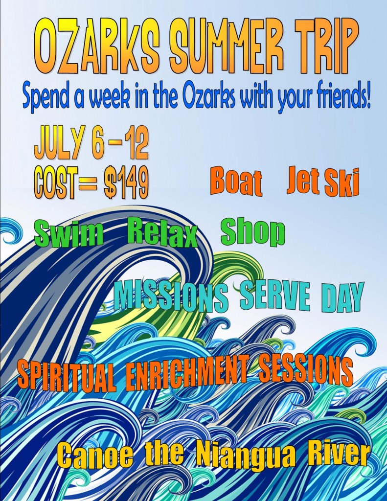 Spend a week in the Ozarks with your friends! Boat and Jet Ski on the Lake of the Ozarks. Swim, Relax, and Shop. Canoe the Niangua River. Soak up the SON during great spiritual enrichment times.