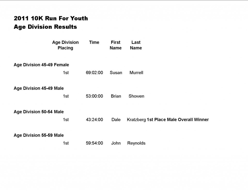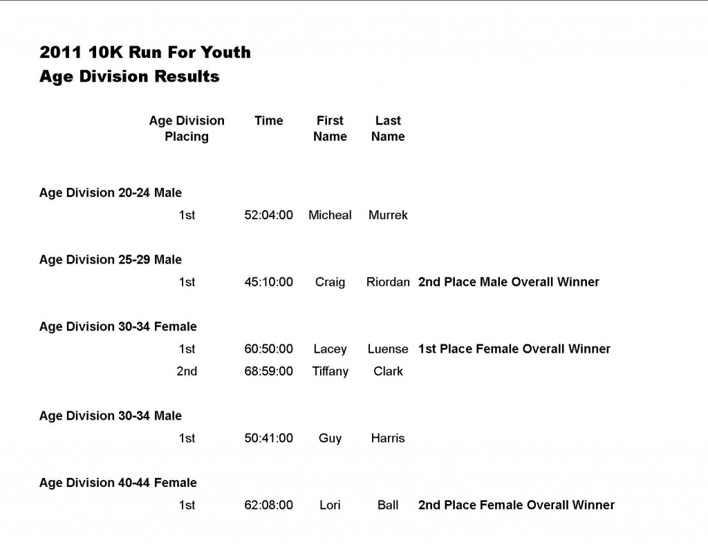 Thanks so much to all the participants in the 3rd Annual RUN FOR YOUTH.  If you are an “overall winner” and did not stay for the awards ceremony, your medal will be mailed to you.  Medals will be mailed to participants who placed 1st or 2nd in their age division.
